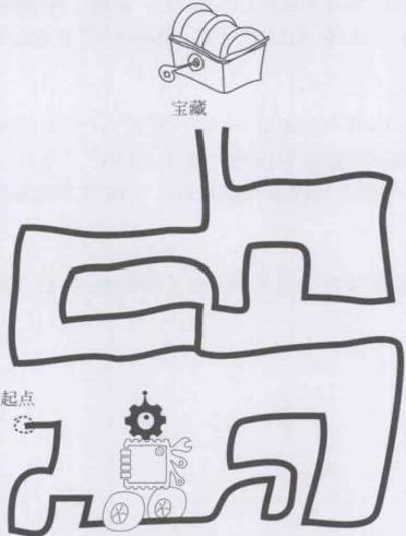 要用黑膠帶制作一幅迷宮地圖,如圖10-3所示。在迷宮的出口處 用一個障礙物當作“寶藏”。然后,我們機器人的任務就是順利通過迷宮并且停在“寶藏” 前面。這里先來處理一個簡化的問題,假設迷宮的地圖是已知的,也就是說,機器人知道應該向什么方向,轉幾次彎才能走出迷宮。